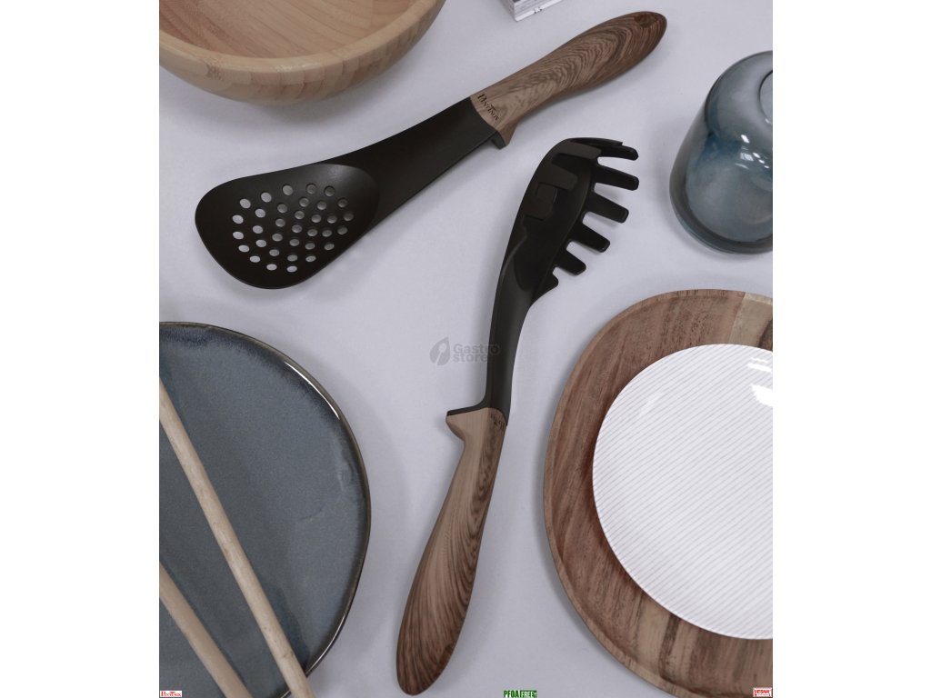 Kuchyňské náčiní italské značky Pintinox z kolekce Chalet má madla tvarována do podpěry zajišťující, že po odložení zůstává pracovní část nástroje ve výšce nad pracovní plochou. Chrání tak pracovní plochu před znečištěním. Kolekce Chalet je typická rukojetí v dekoru dřeva.