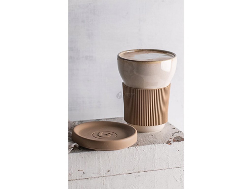 Součástí porcelánového hrnku je silikonové víčko a silikonová objímka.